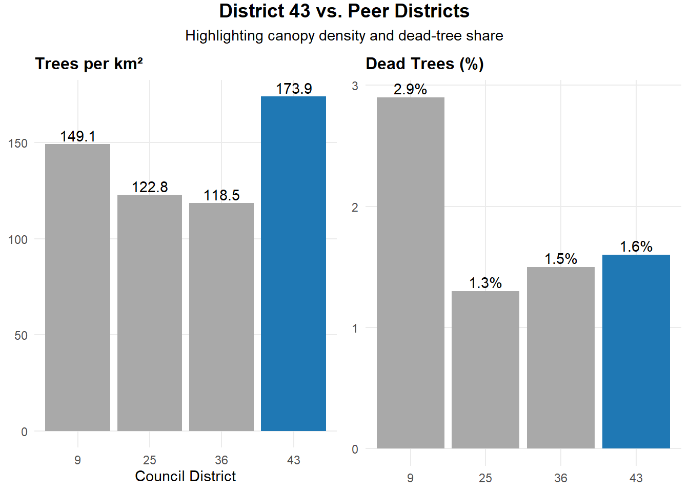 library(cowplot)library(ggplot2)library(dplyr)# Your datacompare_df <- tibble::tribble(~coun_dist, ~dead_share, ~density,43, 1.6, 173.9,9, 2.9, 149.1,25, 1.3, 122.8,36, 1.5, 118.5)compare_df <- compare_df %>%mutate(fill_color =ifelse(coun_dist ==43, "#1f78b4", "#a9a9a9") )# Panel 1 — Trees per km² (NOW FIRST)p_density <-ggplot(compare_df, aes(x =factor(coun_dist),y = density,fill = fill_color)) +geom_col() +geom_text(aes(label = density),vjust =-0.3, size =3.8) +scale_fill_identity() +labs(title ="Trees per km²",x ="Council District",y =NULL ) +theme_minimal(base_size =11) +theme(plot.title =element_text(size =12, face ="bold"),panel.grid.minor =element_blank() )# Panel 2 — Dead Trees % (NOW SECOND)p_dead <-ggplot(compare_df, aes(x =factor(coun_dist),y = dead_share,fill = fill_color)) +geom_col() +geom_text(aes(label =paste0(dead_share, "%")), vjust =-0.3, size =3.8) +scale_fill_identity() +labs(title ="Dead Trees (%)",x =NULL,y =NULL ) +theme_minimal(base_size =11) +theme(plot.title =element_text(size =12, face ="bold"),panel.grid.minor =element_blank() )# Combine side by side — order FLIPPED (p_density first, p_dead second)final_plot <- cowplot::plot_grid( p_density, p_dead,nrow =1,labels =NULL)# Add title + subtitlecowplot::ggdraw() + cowplot::draw_label("District 43 vs. Peer Districts",fontface ="bold", x =0.5, y =0.98, size =14) + cowplot::draw_label("Highlighting canopy density and dead-tree share",x =0.5, y =0.93, size =11) + cowplot::draw_plot(final_plot, x =0, y =0, width =1, height =0.9)
