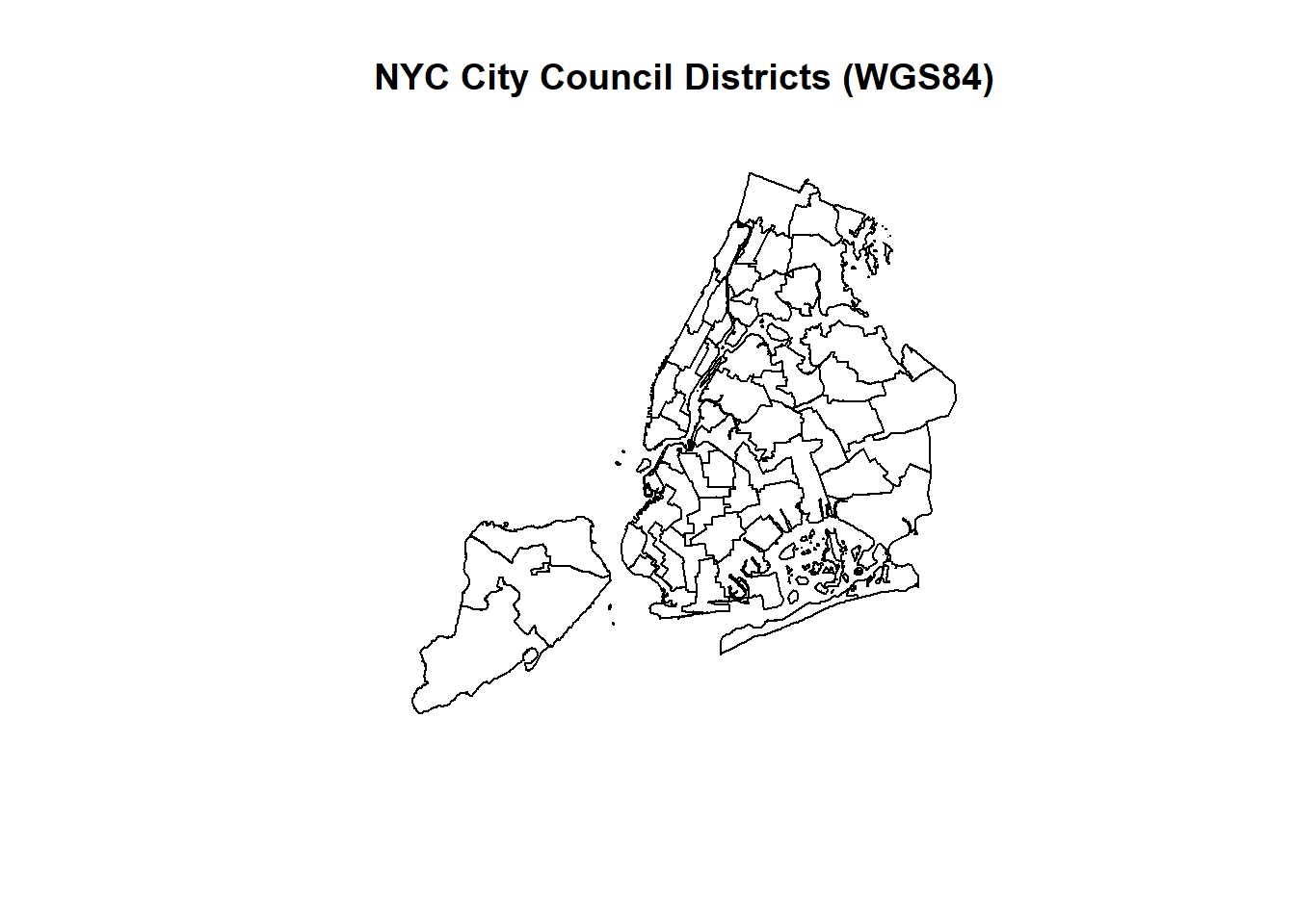 # Install (only if needed)pkgs <-c("sf", "dplyr", "readr", "httr2", "withr")new_pkgs <- pkgs[!pkgs %in%installed.packages()[, "Package"]]if (length(new_pkgs)) install.packages(new_pkgs)# Loadlibrary(sf)library(dplyr)library(readr)library(httr2)library(withr)# .zip link from DCP:council_zip_url <-"nycc_25c.zip"unzip("data/mp03/nycc_25c.zip", exdir ="data/mp03/nycc_25c")# --- Locate the .shp inside the unzipped folder (recursive in case DCP nested subfolders) ---shp_file <-list.files("data/mp03/nycc_25c",pattern ="\\.shp$", full.names =TRUE, recursive =TRUE)if (length(shp_file) ==0) {stop("No .shp found under data/mp03/nycc_25c. Re-check unzip. Try: unzip('data/mp03/nycc_25c.zip', list = TRUE)")}# --- Read, transform, (optionally) simplify ---districts <- sf::st_read(shp_file[1], quiet =TRUE)districts <- sf::st_transform(districts, crs ="WGS84")# Optional: simplify for faster plotting (tweak tolerance if edges look too coarse)districts <- districts %>%mutate(geometry = sf::st_simplify(geometry, dTolerance =5))# --- Quick plot ---plot(sf::st_geometry(districts), main ="NYC City Council Districts (WGS84)")