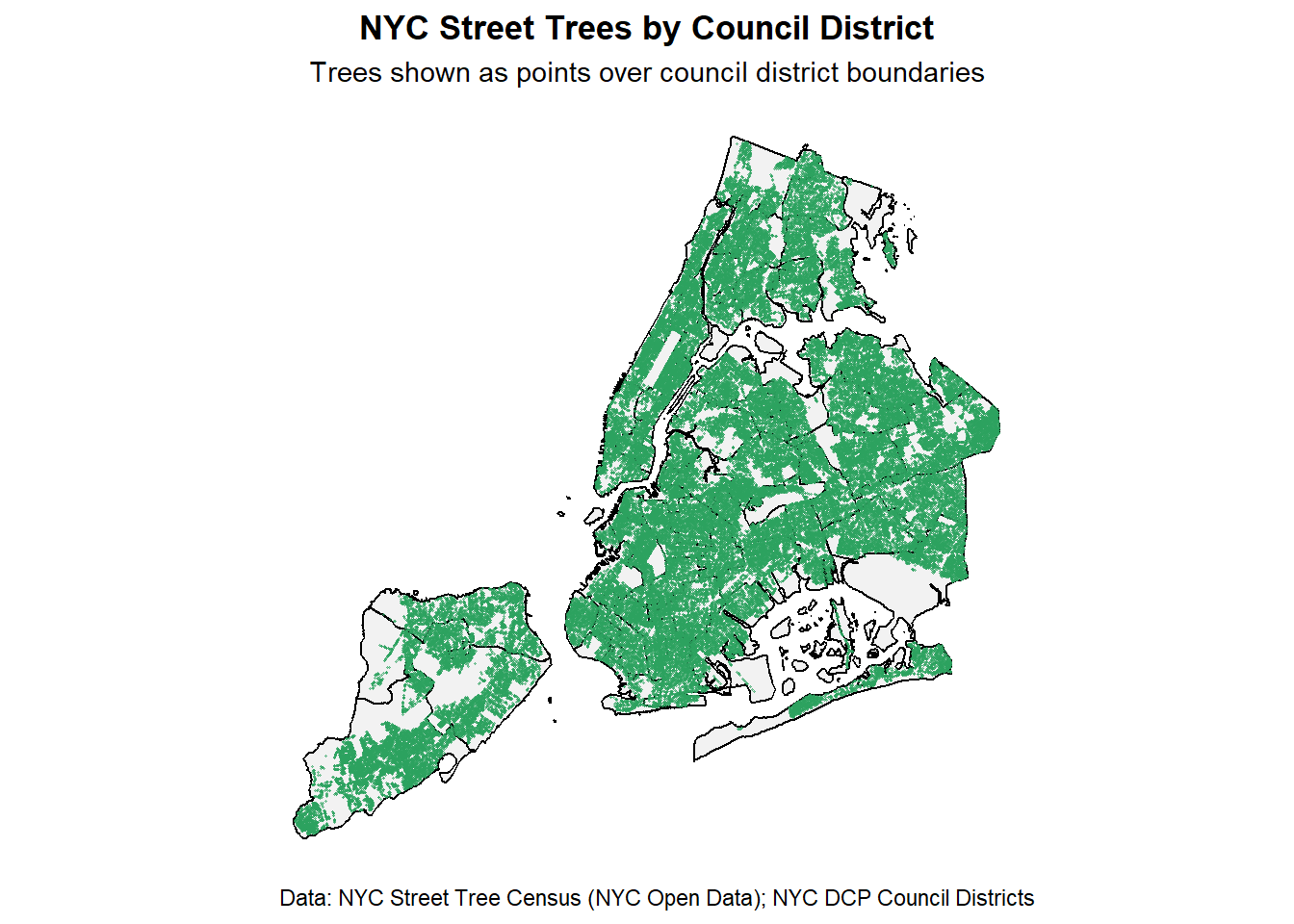 pkgs <-c("ggplot2", "sf", "dplyr")new_pkgs <- pkgs[!pkgs %in%installed.packages()[, "Package"]]if (length(new_pkgs)) install.packages(new_pkgs)library(ggplot2)library(sf)library(dplyr)trees_plot <- treesif (st_crs(trees_plot) !=st_crs(districts)) { trees_plot <-st_transform(trees_plot, st_crs(districts))}set.seed(1)trees_plot_small <- trees_plot |> dplyr::slice_sample(n =min(100000, nrow(trees_plot)))districts_s <- districts |> dplyr::mutate(geometry = sf::st_simplify(geometry, dTolerance =5))ggplot() +geom_sf(data = districts_s,fill ="grey95",color ="black",linewidth =0.4) +geom_sf(data = trees_plot_small,color ="#2ca25f",alpha =0.5,size =0.2) +coord_sf(datum =NA) +theme_minimal(base_size =11) +theme(panel.grid.major =element_line(color ="grey90"),panel.grid.minor =element_blank(),plot.title =element_text(hjust =0.5, face ="bold"),plot.subtitle =element_text(hjust =0.5) ) +labs(title ="NYC Street Trees by Council District",subtitle ="Trees shown as points over council district boundaries",caption ="Data: NYC Street Tree Census (NYC Open Data); NYC DCP Council Districts",x =NULL, y =NULL )