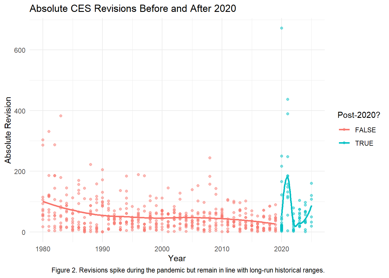 Revisions did spike during the early pandemic, but post-2020 revisions are not persistently or statistically larger. The claim that CES “lost reliability” after 2020 is exaggerated.